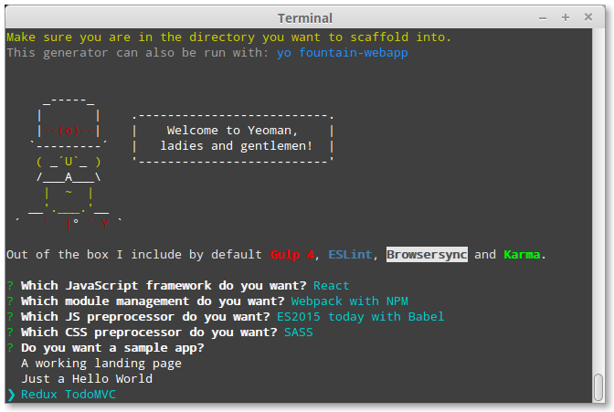 If you have a few generators installed, you’ll be able to interactively choose from them. Highlight Fountain Webapp. Hit enter to run the generator.